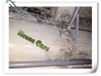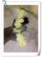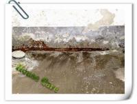 地下室滲水整治工程:本案為水泥澆注後未達養護期即提早拆模所造成之狀況—鋼筋與混凝土間有間系而成為引流管路,不但大量廣域滲水,還互相導引引流,最重要的是鋼筋嚴重腐蝕,此特寫處為地下室柱腳更形嚴重。